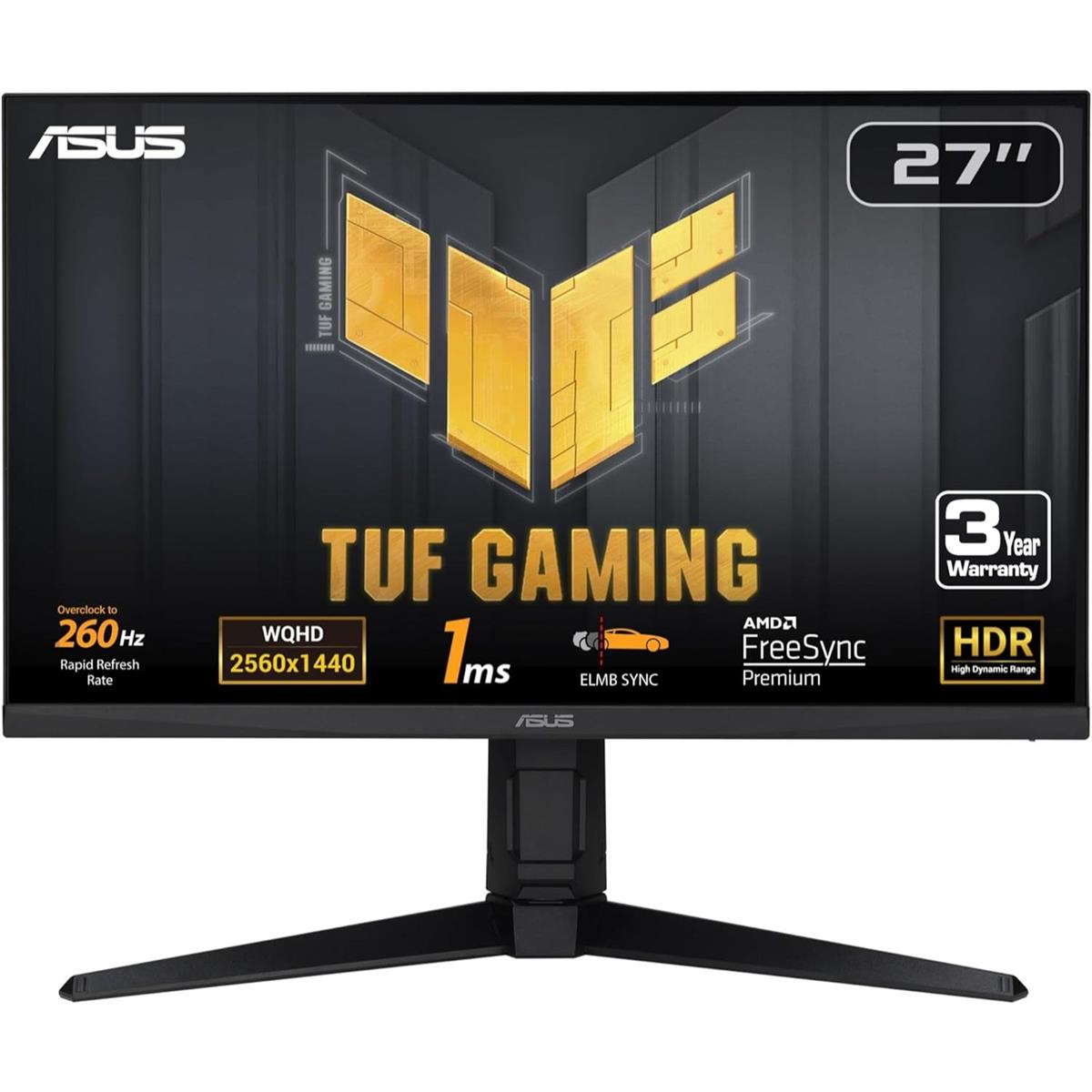 The 27-inch TUF Gaming VG27AQM1A QHD (2560 x 1440) gaming monitor featuring a Fast IPS panel for overclockable to 260 Hz gaming. ASUS Extreme Low Motion Blur Sync (ELMB Sync) and AMD FreeSync™ Premium, G-SYNC compatible, VESA AdaptiveSync technologies enables buttery-smooth gaming.