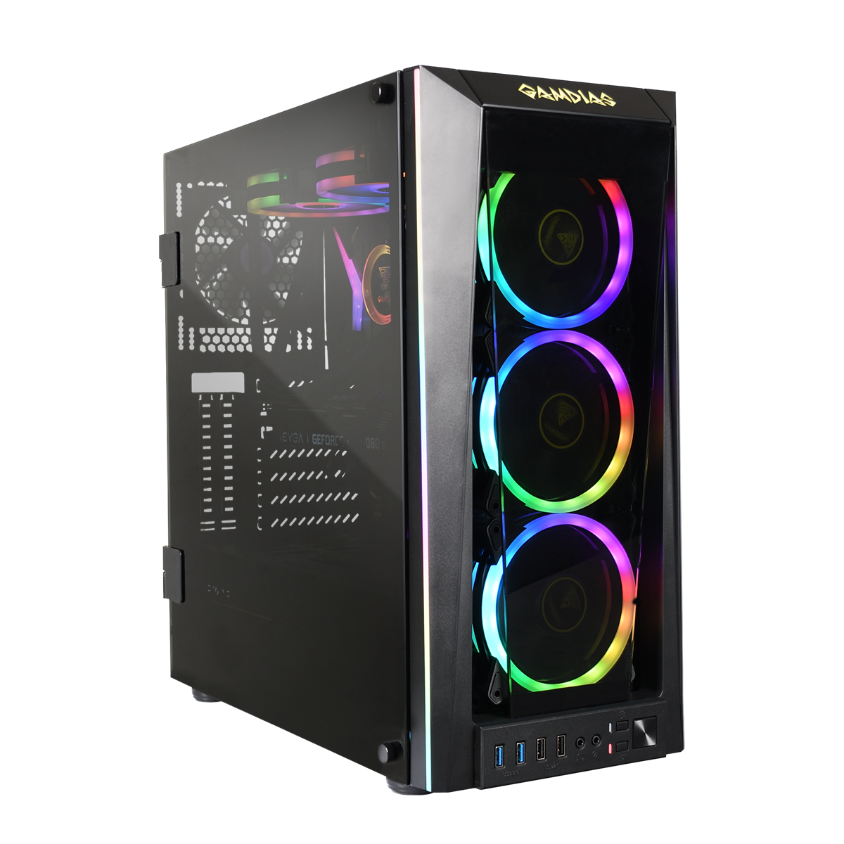 The TALOS M1B is a stylish mid-tower case with a front trapezoidal tempered glass panel that allows robust airflow with three built-in 120mm ARGB fans and two eye-catching ARGB streaming style lighting, and a tempered glass swing door side panel.