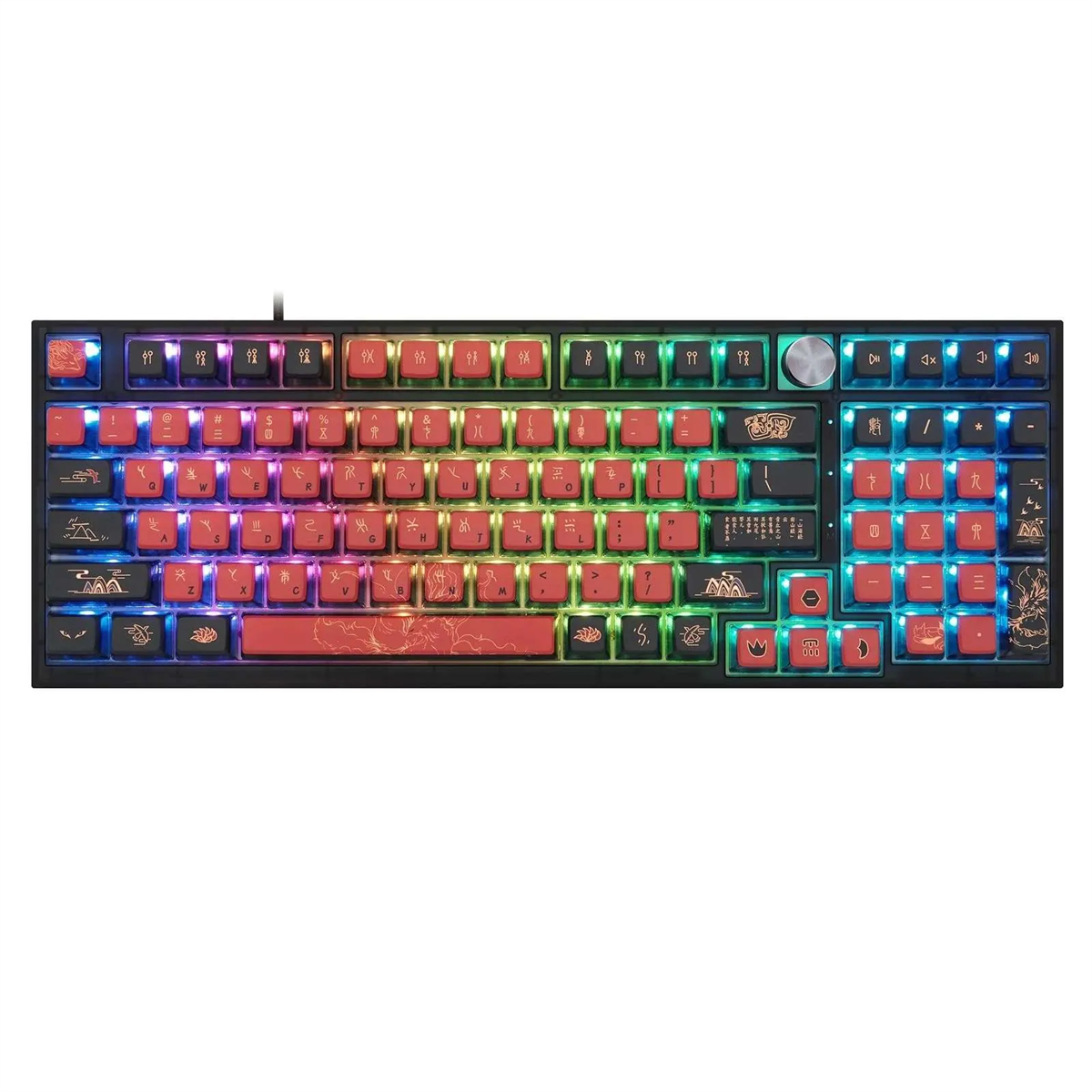 The 98 keys keyboard mounted with unique JIUWEI PBT MDA profile double-shot PBT keycaps, with a knob as a key interspersed at the right middle and black keyboard frame around composed a modern and mystery keyboard.
